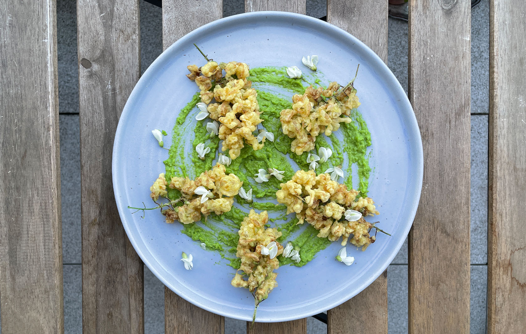 Der Geschmack liegt dabei irgendwo zwischen süßen Zuckerschoten und Jasmintee. In Frankreich werden die "Beignets d'Acacia" oft mit einem Safran-Teig zubereitet. Diese exotische Würzung bringt Finesse in diesen eigentlich sehr rustikalen Snack. Dazu passend eine "Guacamole" aus Vogelmiere und Erbsen - auch davon kann niemand jemals genug haben, dieses Gericht ist einfach ein Volltreffer!